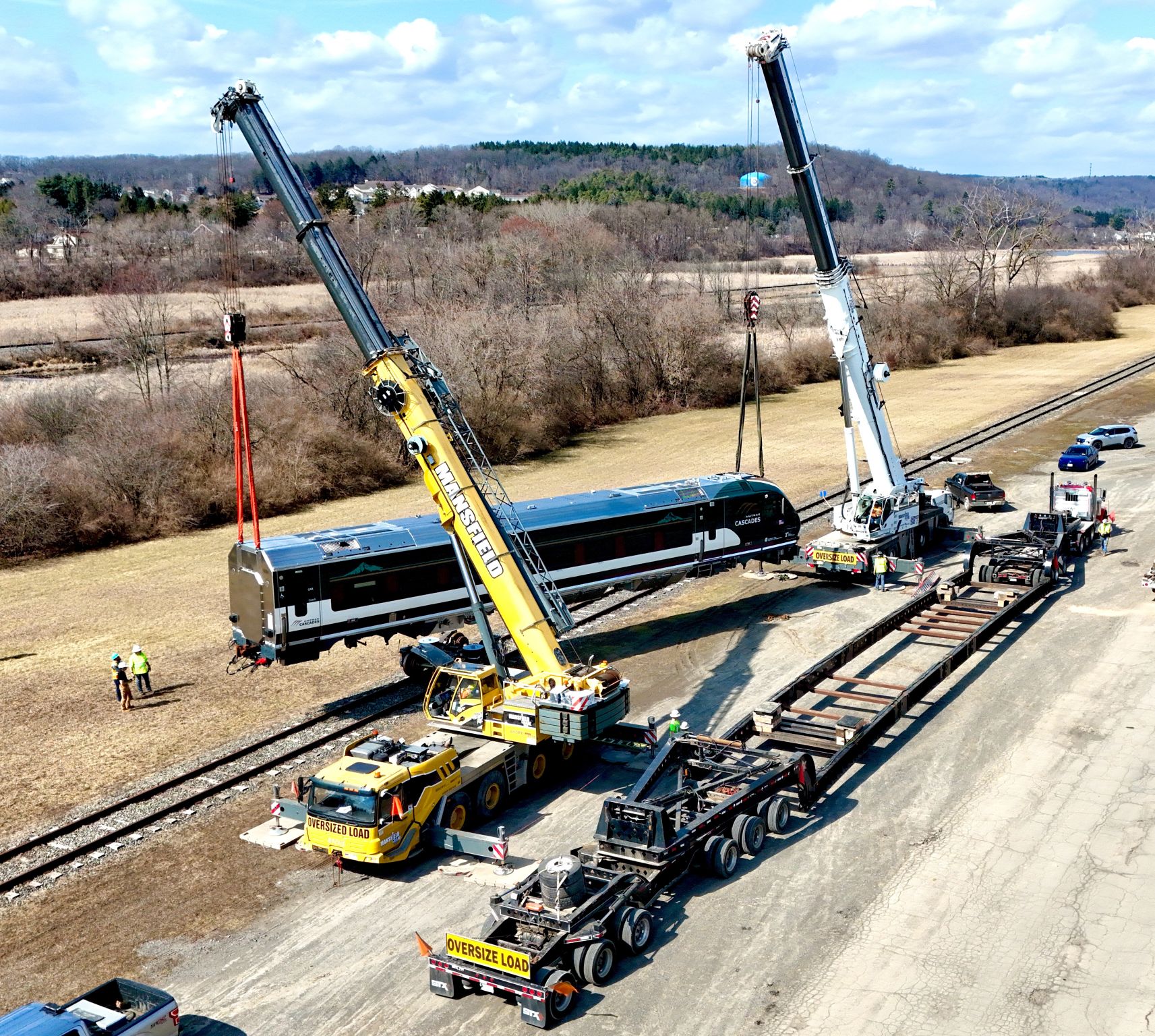 Mansfield Crane was recently on the job for a unique experience. We used two cranes to do a tandem lift with a pass through between cranes. By doing this tandem lift we were able to transfer the rail car from the track side to a 13 axel perimeter frame trailer.